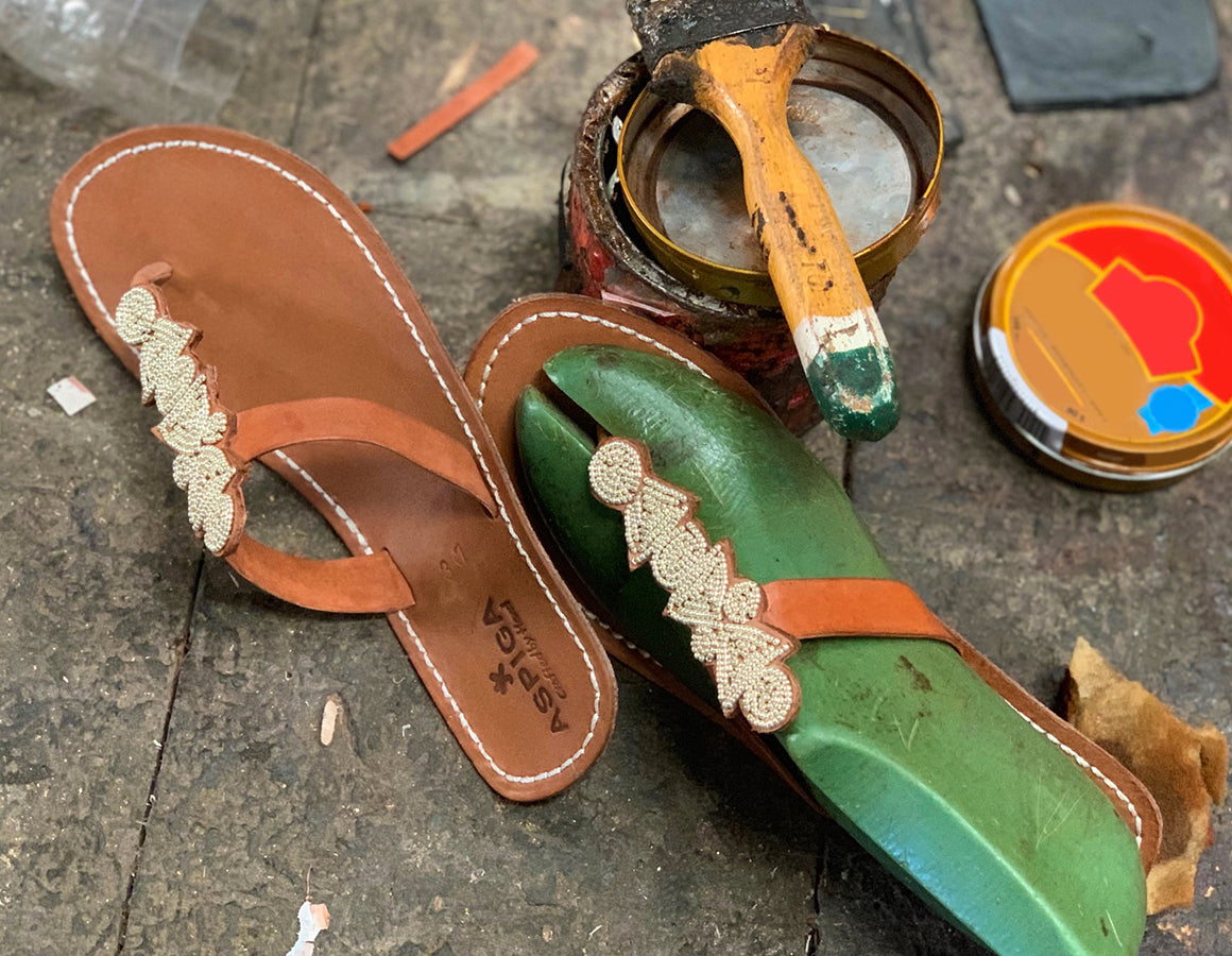 Our Kenyan family comprises of five family run workshops that employ talented artisans to make our Kenyan sandals, beaded belts, and Kikoy towels. The income they receive from Aspiga often goes towards funding their families' education and living costs and also supports their extended families, who rely on this income.