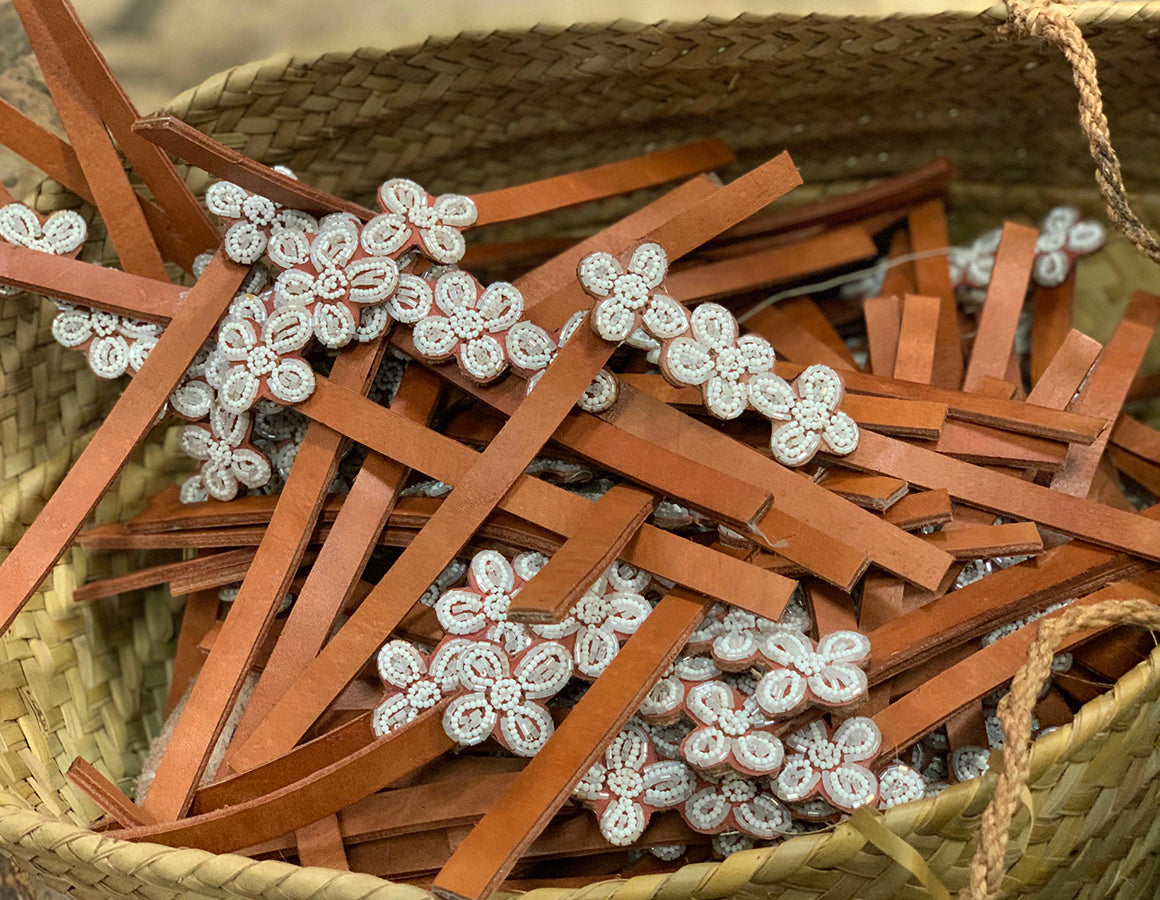 The beadwork for our Kenyan Sandals can take up to 3 hours per pair. The craftsmanship takes precision and the process involves artisans sorting the beads and threading them into complex patterns then sewing through punched holes directly on the leather.